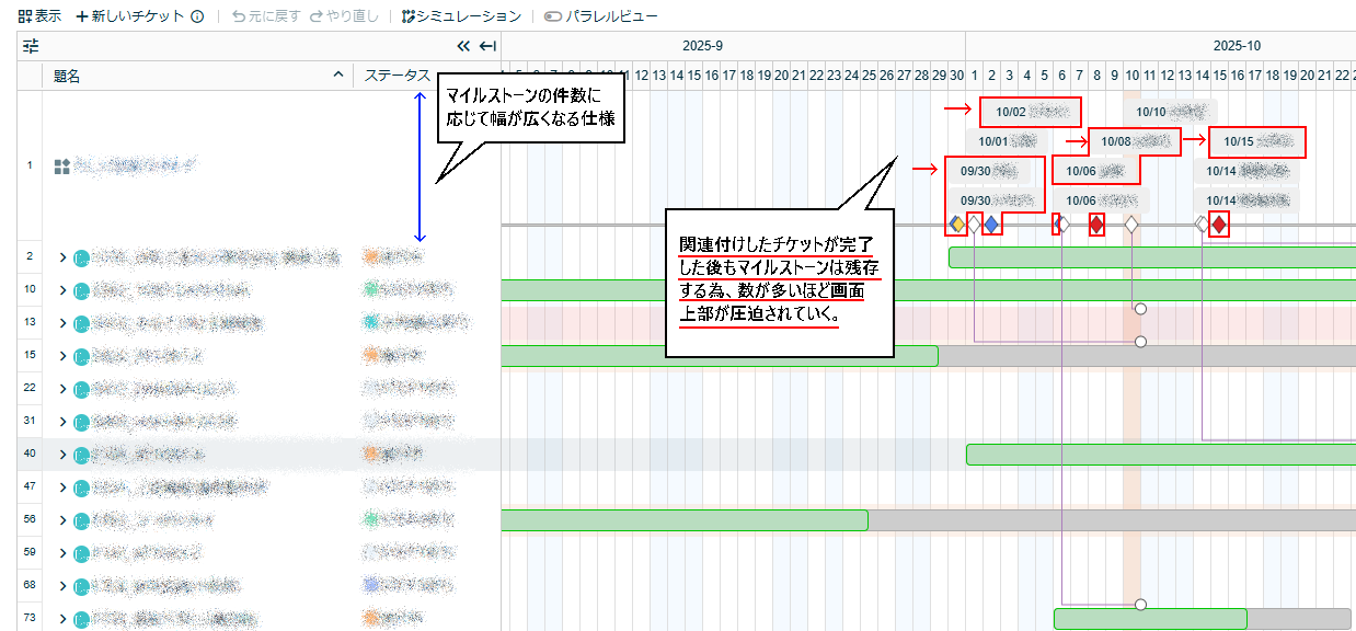 ■ガントチャートのマイルストーンについて、関連付けしたチケット完了で連動して非表示にして欲しい